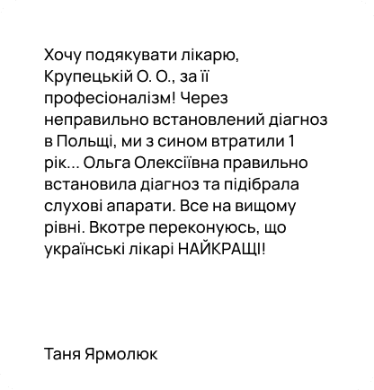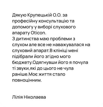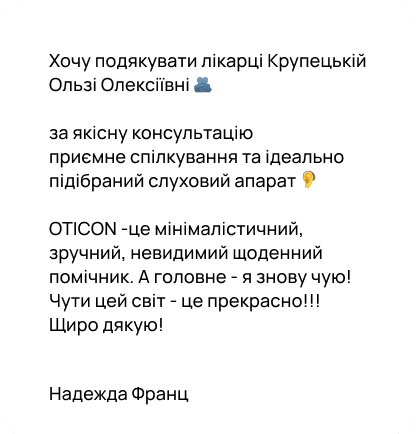 Консультація зазвичай триває 30–60 хвилин. За цей час лікар проводить огляд, перевірку слуху та за потреби підбирає слуховий апарат.